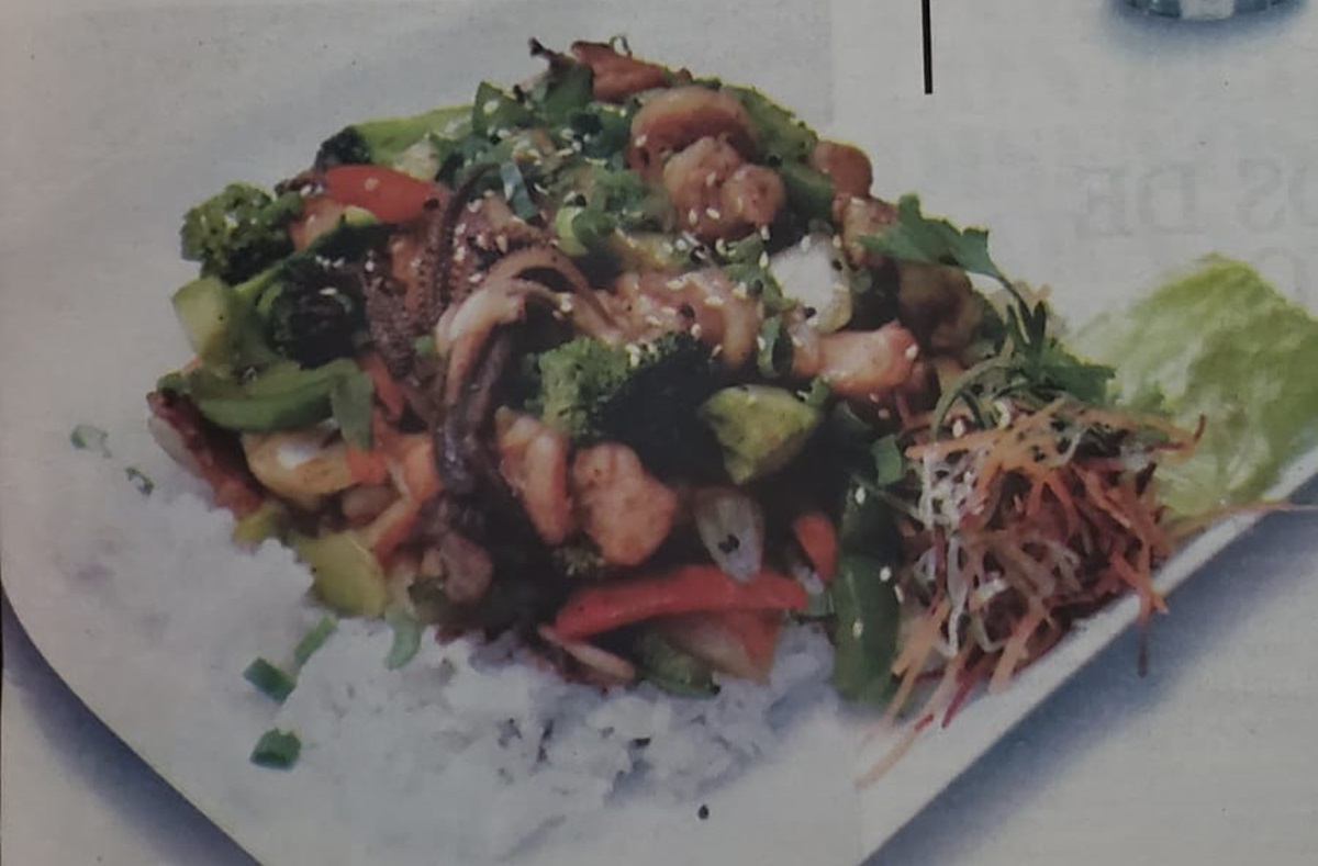 Saltear los mariscos en el wok en aceite con ajo, agregar vegetales previamente desinfectados y picados en trozos y seguir salteando. Sazonar e incorporar la salsa teriyaki y, una vez que esté listo, montar en el plato una cama de arroz y colocar encima el guiso. Por último, espolvorear ajonjolí y cebollín sobre el platillo.