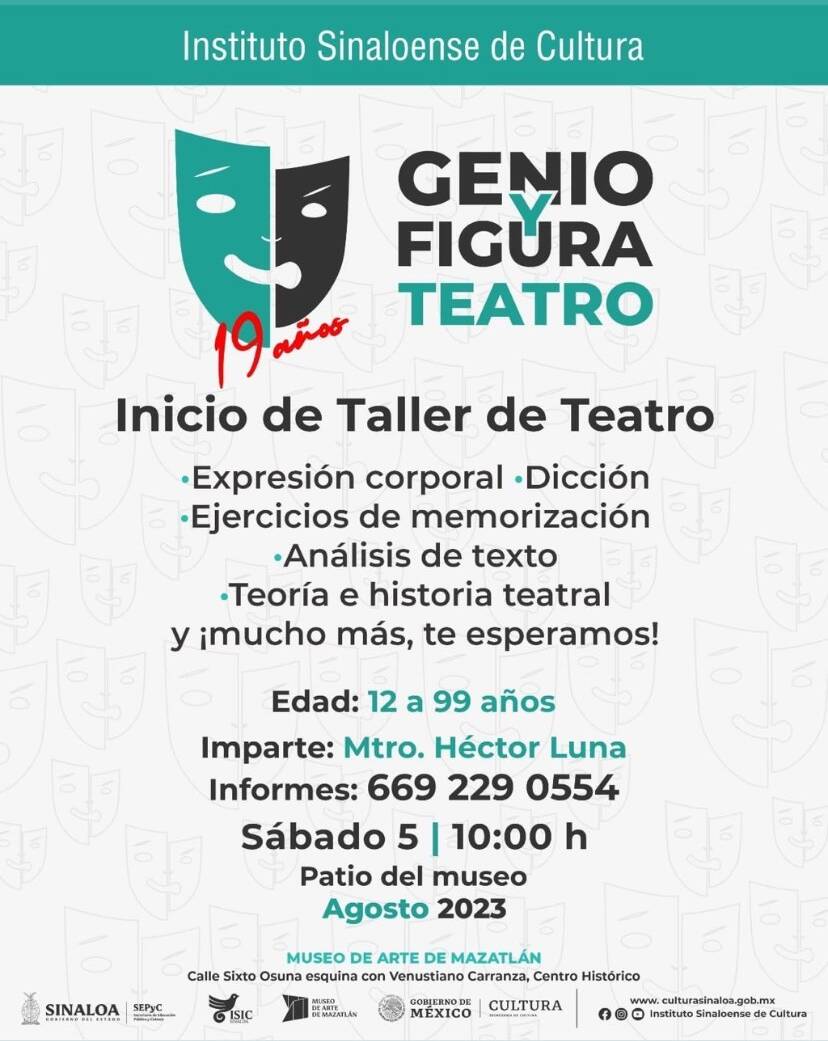Mazatlán, Sinaloa – Dentro del marco del 19 aniversario de Genio y Figura Teatro, se tiene previsto utilizar el patio del Museo de Arte de Mazatlán para la realización de su edición más reciente del taller de teatro que será impartido por el maestro Héctor Luna.