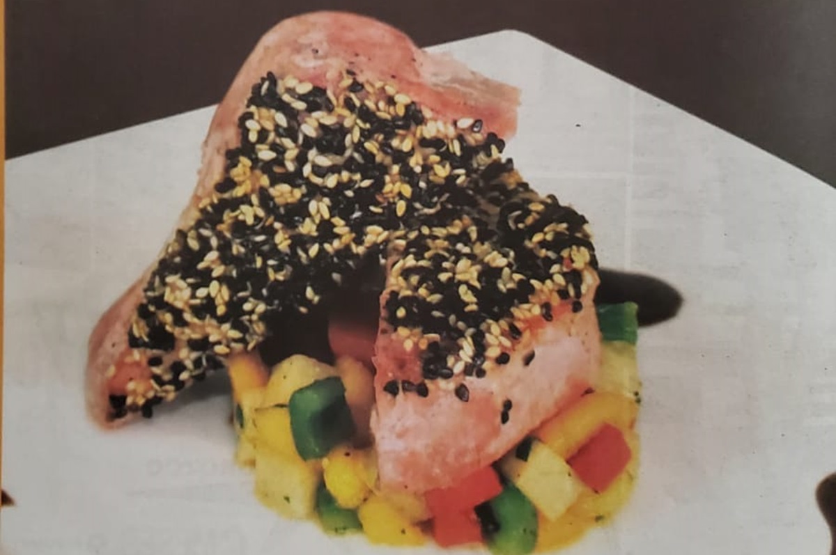 Primero, se corta la fruta y la verdura en cuadros pequeños: chile morrón, mango, pepino. Siguiente paso, hacer la vinagreta con vino tinto y añadirle las verduras. Posteriormente, sellamos el atún con aceite de oliva y continúa cubriendo el atún con el ajonjolí para que se haga una costra y se sazone un minuto, porque si dura más tiempo pierde el sabor el atún y no se cocina jugoso. Una vez que está listo el atún, se corta en dos pedazos y se monta sobre el aro que formó con las verduras y la vinagreta. A las verduras le puede agregar una pizca de hojas de cilantro o perejil, al gusto de cada persona y listo, ¡a saborear!.