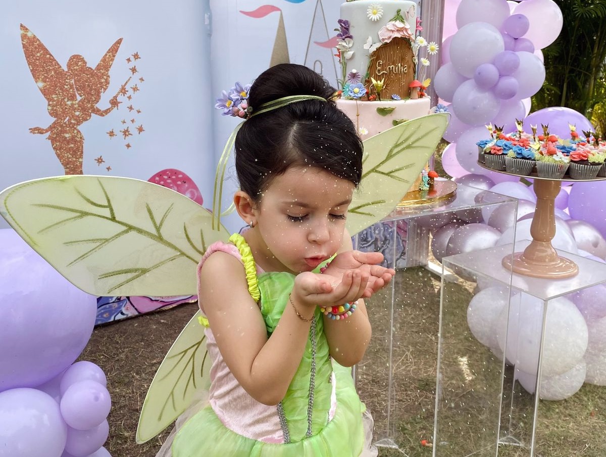 Los gentiles anfitriones obsequiaron a los invitados falditas y alas de hadas, polvo de hadas y dulces. Los chiquitines hicieron picnic y se divirtieron en los brincolines y apaleando las enormes piñatas.