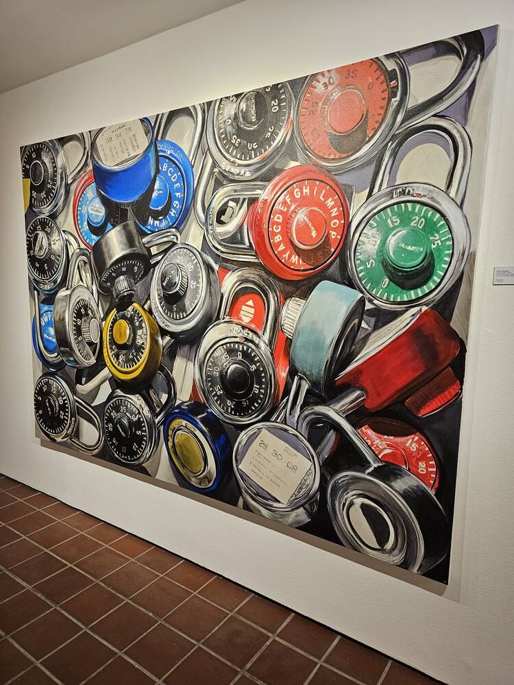 Piezas que están compuestas de coloridos collage que están conformados por retratos mezclados con objetos como cartas de baraja, teléfonos antiguos, siluetas femeninas de diferentes formas y tamaños, ojos con diferentes expresiones plasmados en un color fosforescentes, candados con combinaciones y más.