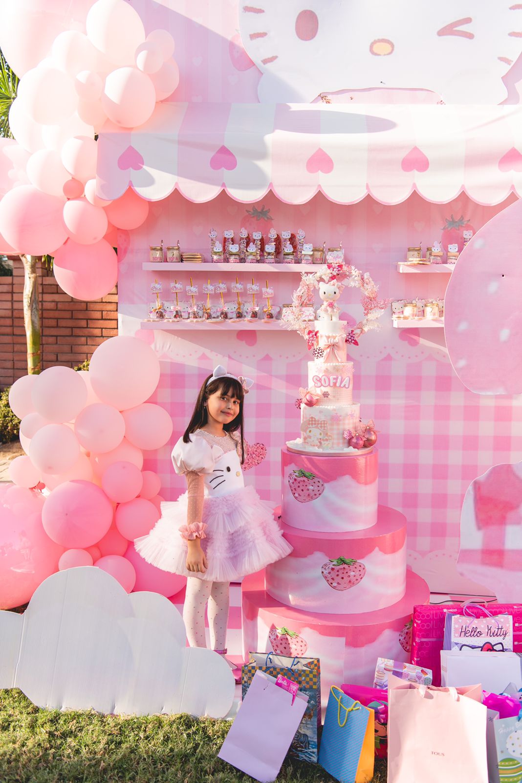 Sofía escogió el tema de su fiesta, «Hello Kitty» la gatita tierna y dulce como la cumpleañera, y para la ocasión lucio dos vestidos preciosos, diseñados por su querida mamá, para Sofia’s Closet.