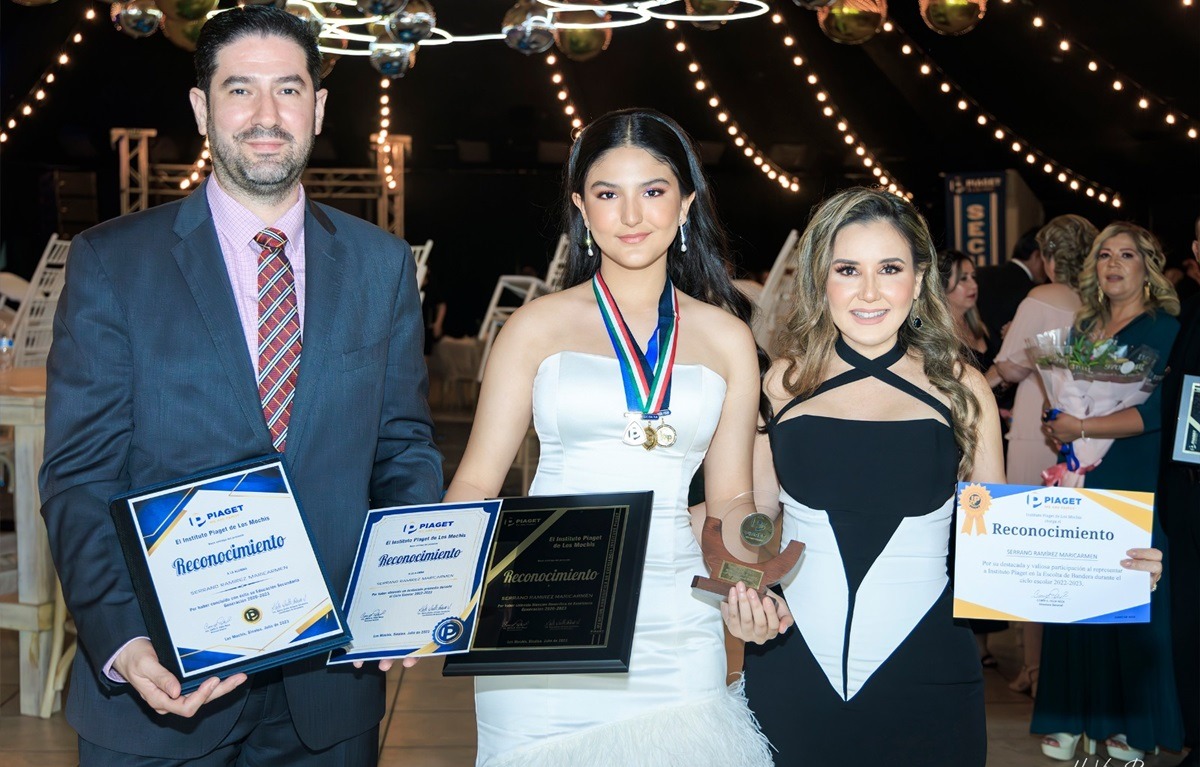 Los Mochis, Sinaloa.- En el Country Club se llevó a cabo el acto académico del Instituto Piaget donde la jovencita Maricarmen Serrano Ramírez recibió medallas y placa de mención honorífica de excelencia de la generación, de manos de la directora general de la institución educativa, Corin Félix Reza.